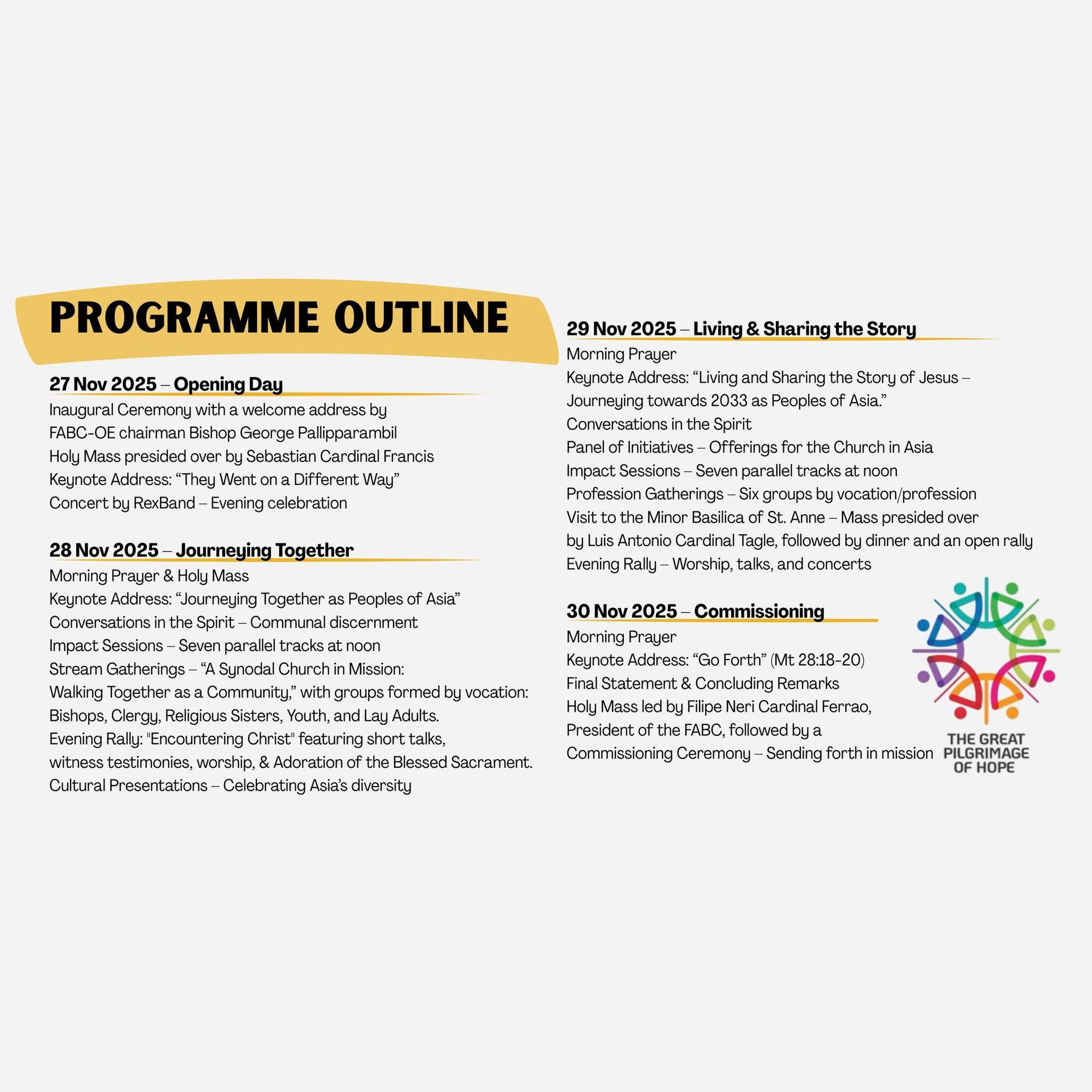 Synodality and Mission: Impact Session with Father Clarence Devadass Taking the Church Forward in a Synodal Way The Great Pilgrimage of Hope 2025 featured an Impact Session with Father Clarence Devadass, who spoke candidly about synodality and its place in the life and mission of the Church. He reminded participants that this was a time of listening, sharing, and discerning together. The aim was to leave with conviction: each participant must ask, “What can I do when I get back?” Synodality, he stressed, is about becoming agents of change in our homes, parishes, dioceses, and communities. Father Clarence explained that synodality is not a “band-aid” solution to all the Church’s problems. It is not a project, a management programme, or a strategic plan. Rather, it is a spirituality, a way of being Church. “Since 2021, the word “synodality” has been added to many events and documents, but often without real change in practice. True synodality requires conversion: of mindsets, of relationships, of processes, and of structures. It is not about adding more burdens to priests or parish leaders, but about infusing the spirit of synodality into what is already being done, whether in Eucharist, parish meetings, or assemblies.” He highlighted three pillars of synodality: communion, participation, and mission. “Communion calls the faithful to unity and to journey together without leaving anyone behind. Participation invites every baptised person to recognise and share their gifts, overcoming exclusion and embracing diversity. Mission reminds the Church that it exists to evangelise, bringing God’s love especially to those at the peripheries. Synodality, therefore, is not an end in itself but a pathway to transformation and conversion.” Listening and discernment are central to synodality. Father Clarence emphasised the importance of listening to one another and to the Holy Spirit, suspending judgement and resisting the urge to provide instant solutions. “Synodality is not parliamentary democracy or majority rule; sometimes the Spirit speaks through the minority voice.” He added that what matters is the process of decision-making, marked by genuine consultation and openness, not token gestures. “Consultation must be sincere, not for show, and must engage the faithful meaningfully in the life of the Church.” He acknowledged the cultural barriers that make synodality challenging in Asia. “Linguistic diversity complicates even the translation of the word “synodality.” Deep respect for hierarchy can limit accessibility to Church leaders, while patriarchal structures continue to diminish the role of women. Silence and avoidance are also common, with faithful preferring to wait out a parish priest’s tenure rather than engage in dialogue.” He added that these realities must be confronted if synodality is to take root in the region. He noted that servant leadership requires humility and accessibility, not distance or privilege. Synodality, Father Clarence reminded participants, is not time-bound to 2028 nor dependent solely on Pope Francis. “It is a renewal of the Church’s identity as the People of God. Through baptism, we all share in the threefold ministry of priest, prophet, and king, making every member a stakeholder in the Church’s mission.” He added that synodality strengthens the Church’s witness, builds unity in diversity, and responds to contemporary challenges such as declining attendance, questions of relevance, and the credibility of the Church in the face of scandal. “It is not about changing doctrine, but about expressing the Church’s identity as the People of God, discerning together what the Spirit is saying.” Father Clarence also spoke of the need to expand the tent, echoing Pope Francis’ call, highlighting that the challenge is not only to welcome more people, but to open the hearts of those already inside. “Too often, insiders resist welcoming those who are different, waiting until they are “perfect” before allowing them in. Synodality calls for universal participation, recognising diverse gifts and talents, and moving the faithful from passive recipients to active agents of faith. It is about dialogue, communication, and engagement, both within the Church and with people of other religions and those at the margins.” He added that synodality is about moving forward in hope, transforming passive recipients into active agents of faith. “It expands the tent, not only to welcome more people but to open the hearts of those already inside.” He stressed that synodality is about mission, communion, and participation to become a Church that listens, discerns, and walks together. He reminded participants to carry this spirituality home, embodying synodality in daily life and becoming agents of change in their communities. The impact session concluded in a beautiful synodal action of the participants of the impact session saying the Lord’s prayer in their own languages representing the 30 countries present.