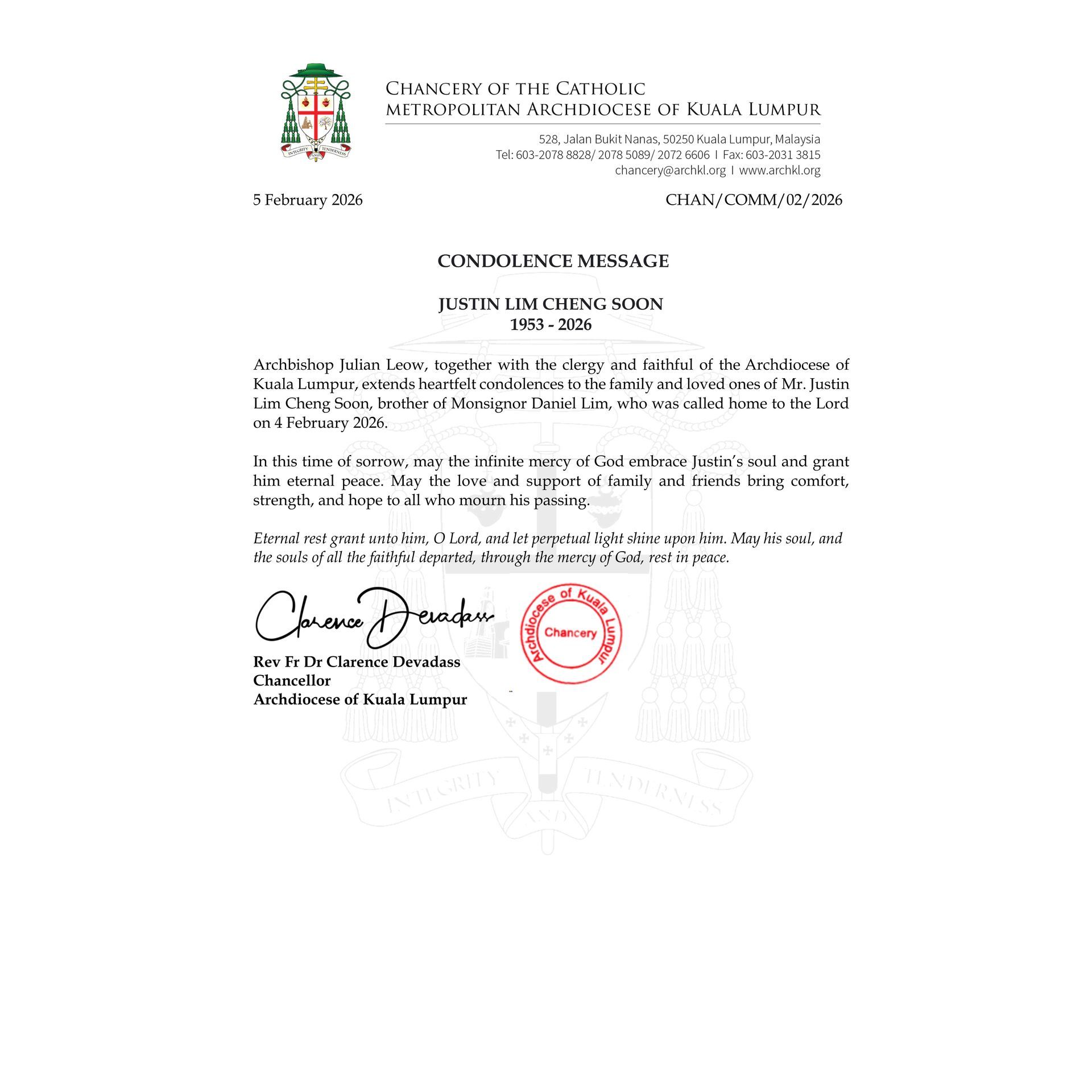 Rooted in a legacy that began in 1786, the Archdiocese of Kuala Lumpur stands as a beacon of faith and unity for the Catholic faithful throughout Malaysia. Over the centuries, it has grown into a vibrant and diverse community, embracing people from all walks of life. Guided by the teachings of Christ, the Archdiocese is dedicated to nurturing spiritual growth, fostering compassion, and promoting justice and peace. Through service, evangelisation, and outreach, it continues to spread hope and charity in every corner of the nation.