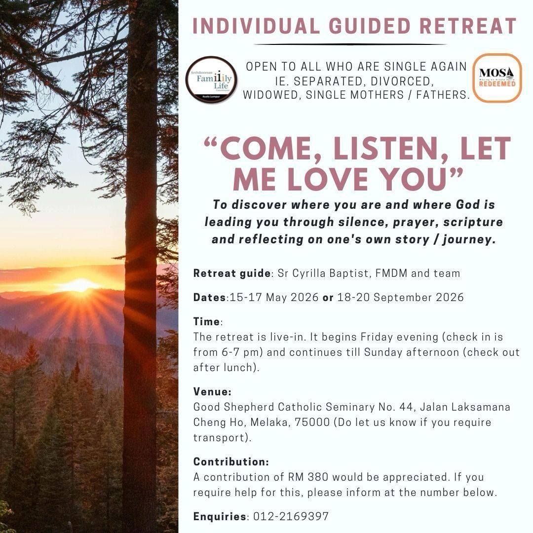 The Individual Guided Retreat invites participants to a weekend of quiet reflection and spiritual discovery at the Good Shepherd Catholic Seminary in Melaka. Facilitated by Sr Cyrilla Baptist, FMDM, this live-in experience is designed for those seeking peace through silence, prayer, and scripture.