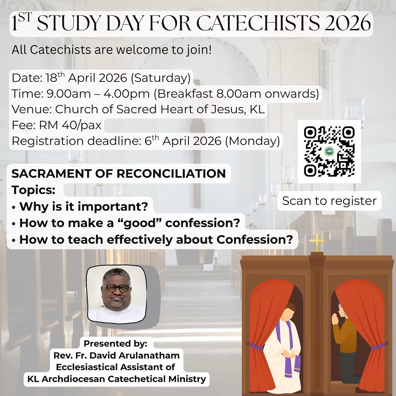 The session will be presented by Rev. Fr. David Arulanatham and costs RM 40 per person. Breakfast will be served from 8:00 am. Interested participants must register using the provided QR code by Monday, 6 April 2026.