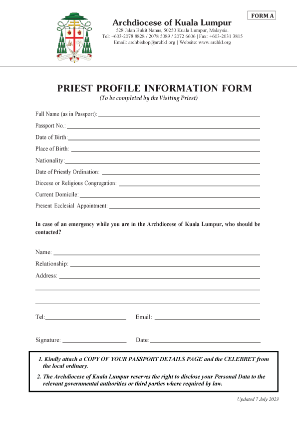 - Form C: A commitment from the visiting priest to adhere to the conditions set by the Archdiocese.