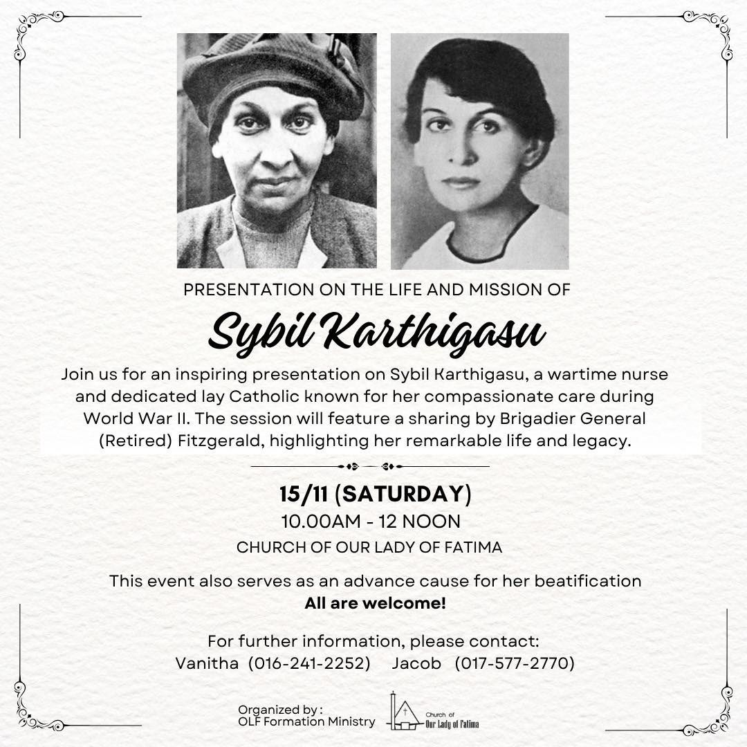 Join us for an inspiring presentation on Sybil Karthigasu, a wartime nurse and dedicated lay Catholic known for her compassionate care during World War II. The session will feature a sharing by Brigadier General (Retired) Fitzgerald, highlighting her remarkable life and legacy.