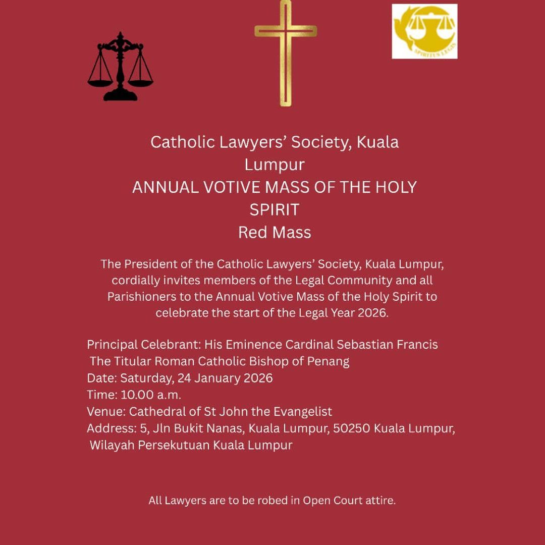 The Catholic Lawyers Society (CLS) warmly invites all members of the legal community and the faithful to attend the Annual Red Mass , presided over by His Eminence Sebastian Cardinal Francis . The "Red Mass" is a historic tradition that dates back to the 13th century. It is named after the red vestments worn by the clergy, symbolising the tongues of fire of the Holy Spirit, which represent the wisdom and justice sought by those in the legal profession. Let us come together in prayer for the legal fraternity and for the fair administration of justice in our nation.